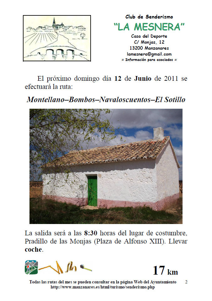 El Club Deportivo Elemental de Senderismo "La Mesnera" informa a sus asociados que el domingo día 12 de junio de 2011 se efectuará la siguiente ruta de 17 km.: Montellano - Bombos - Navaloscuentos - El Sotillo.
